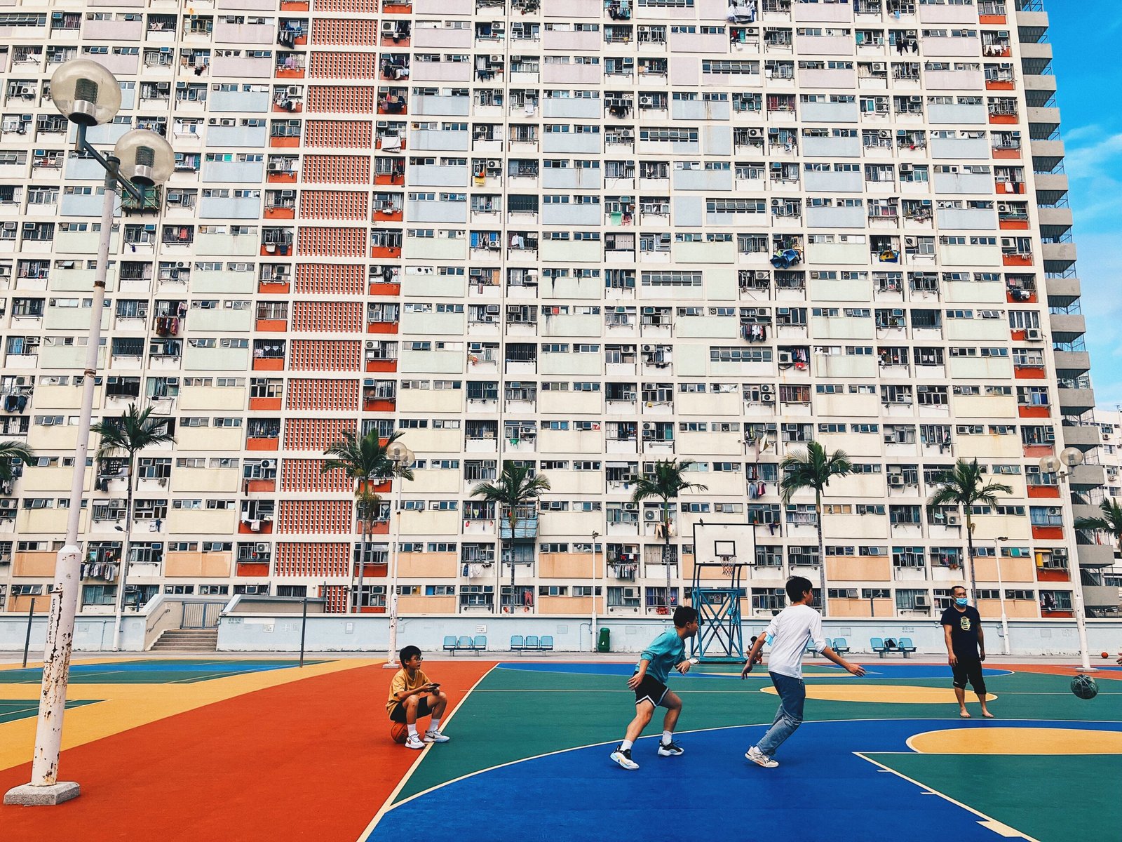 至於想拍攝平時經典大廈七色外牆,當然要走到停車場天台樓層。只是我沒想到天台原來是如此熱鬧,全因它同時是花園、籃球場和羽毛球場,有不少人都在此休憩或玩樂,但這亦編織成另一片街坊生活日常的美麗風景。