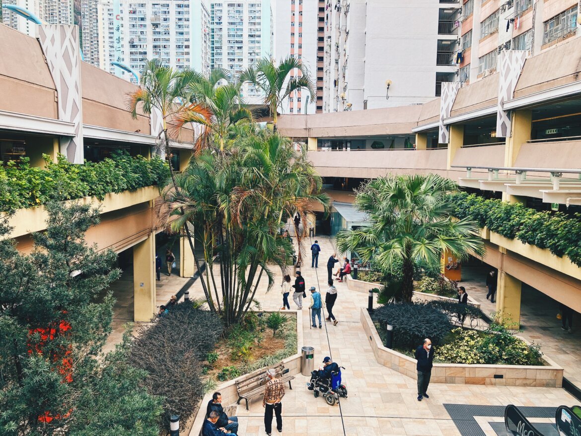離開屋邨商場,沿着接駁天橋漫步到中央平台位置,多座彩雲邨的大廈四面環繞,高低有致地排列,景致開揚,形成另類的屏風般的風景。不少小朋友在平台上奔跑嬉鬧,陣陣的歡笑聲為屋邨帶來更多生氣,笑聲也不經不覺地感染到附近聊天的街坊,他們的面容看起來是如此的放鬆愜意。